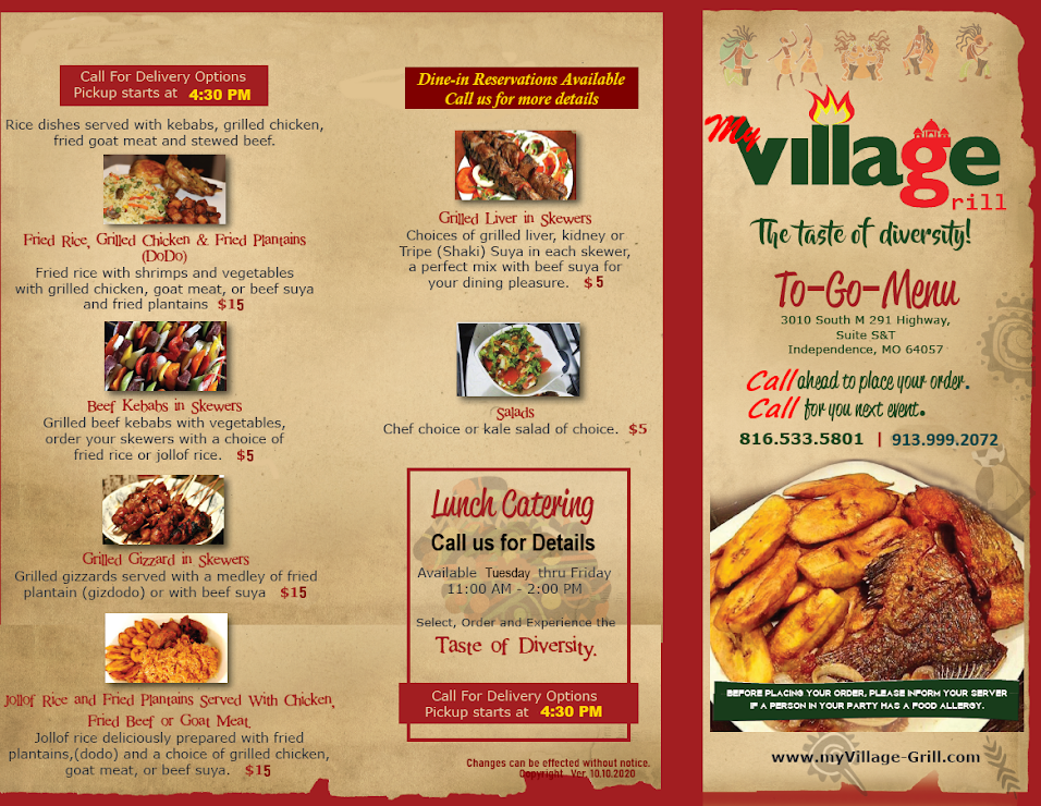 Welcome to My Village-grill Restaurant, a hidden gem located at 26 E 39th St, Kansas City. This restaurant brings the vibrant flavors of West Africa directly to your plate, with a menu thoughtfully crafted to delight meat lovers and adventurous eaters alike.
