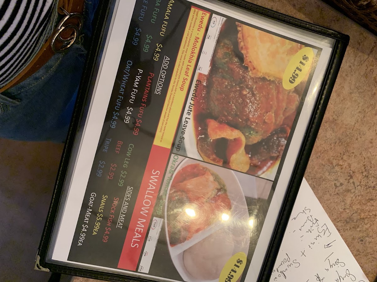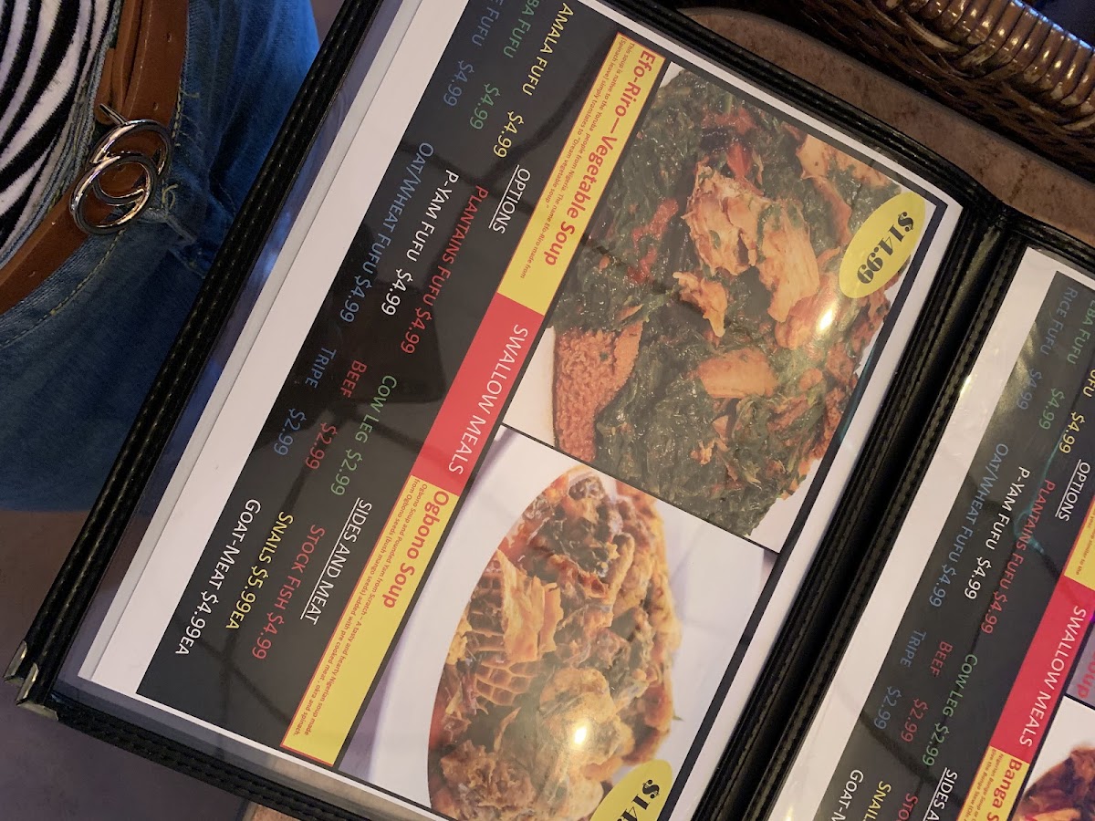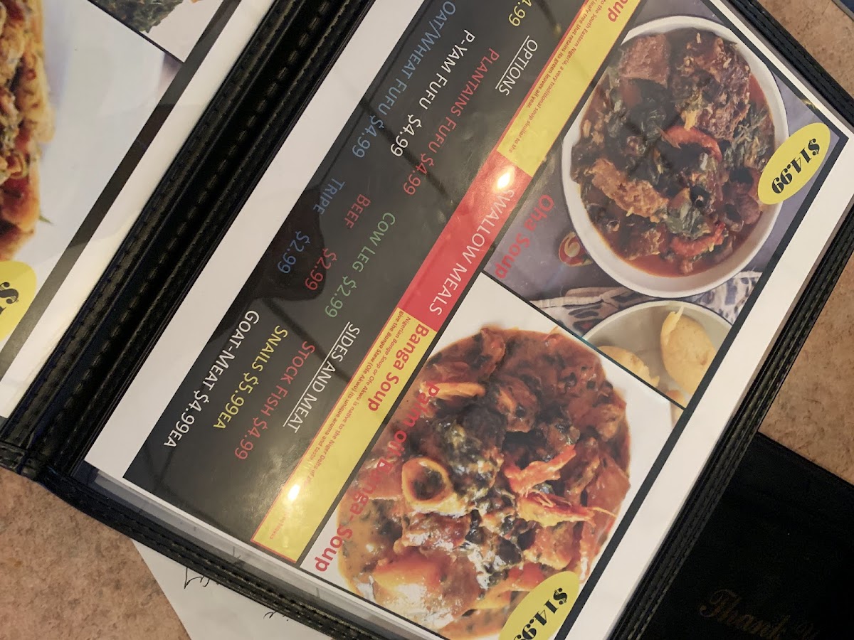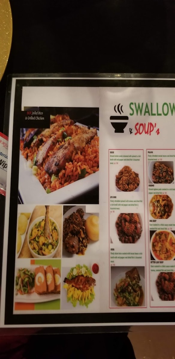 The menu highlights a variety of all-day meat grills, featuring the tender Tripe Suya and Gizzard Suya, both seasoned to perfection. For those seeking unique flavors, the Gizdodo pairs luscious plantains with succulent gizzards, while the Pepper Soup Catfish offers a taste of bold African spices.